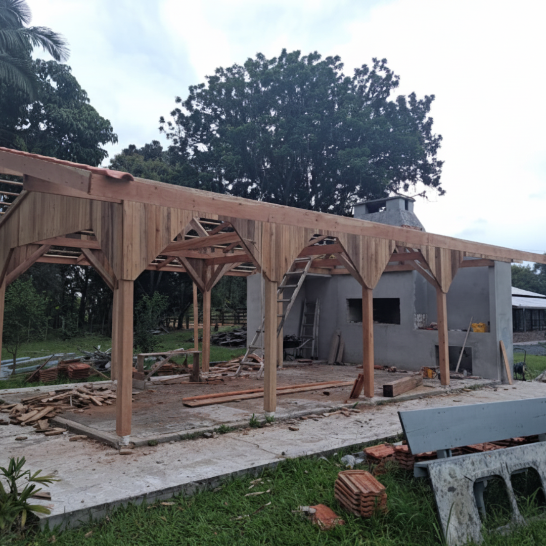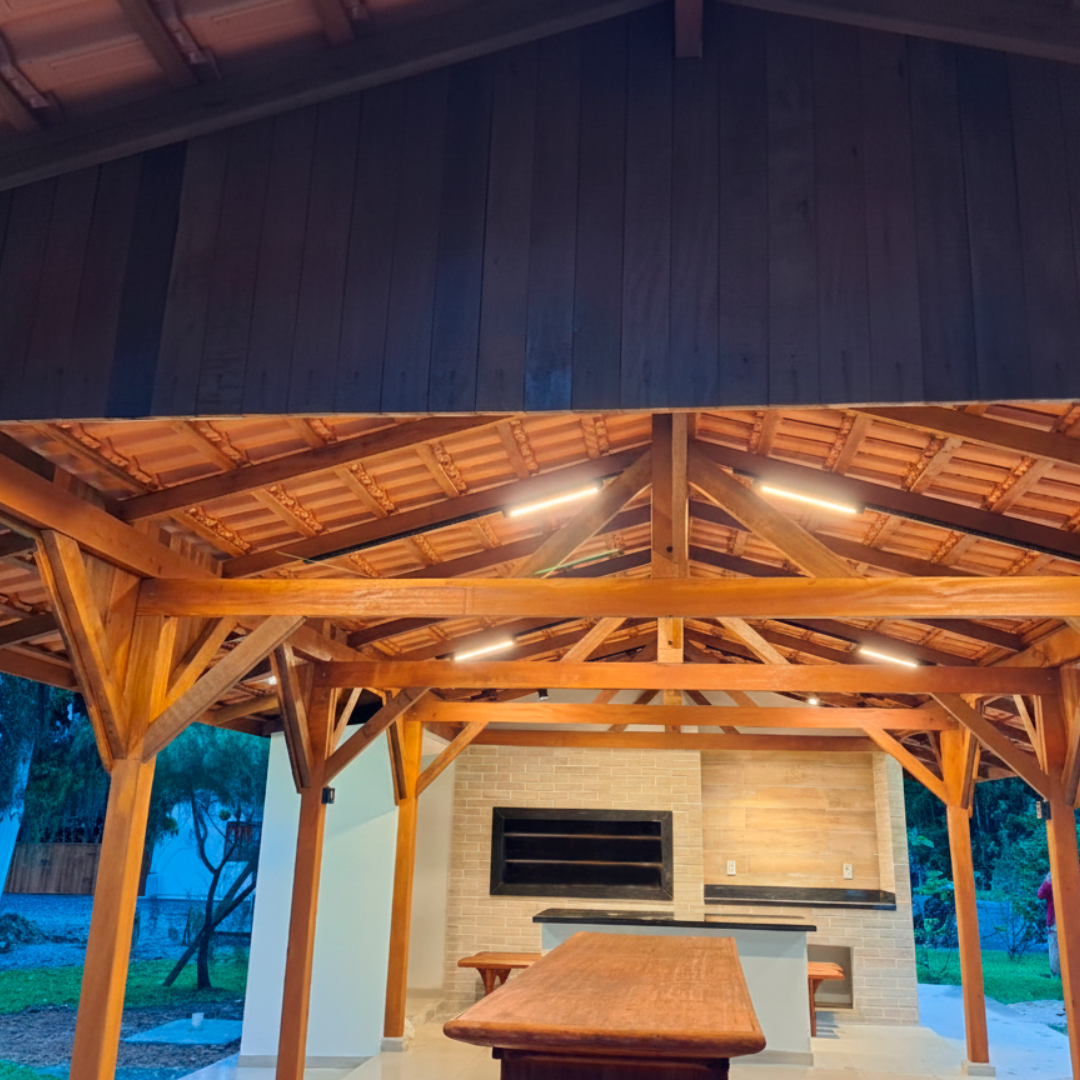 Entregamos um espaço gourmet completo e aconchegante, ideal para quem busca o melhor em lazer ao ar livre. A imponente estrutura de madeira aparente e o telhado cerâmico conferem um charme campestre e elegante, enquanto a iluminação embutida no madeiramento cria um ambiente acolhedor, perfeito para o uso diurno e noturno. A área de churrasqueira, com acabamentos em tijolinho e revestimento amadeirado, e as bancadas em granito combinam beleza e alta funcionalidade, resultando em um ambiente convidativo para desfrutar com amigos e família